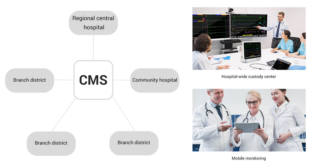 يوفر مركز إدارة بيانات نظام المراقبة المركزي مجموعة متنوعة من واجهات بروتوكول البيانات، والتي يمكنها التواصل بمرونة مع نظام معلومات المستشفى، وتبسيط عملية العمل ومساعدة الأطباء في التشخيص مع ضمان أمن بيانات المريض.