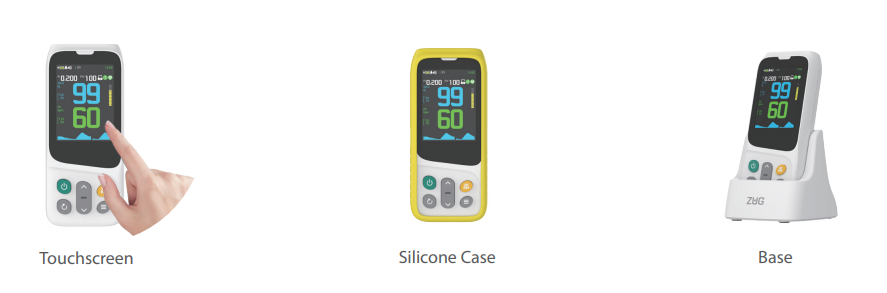 يتضمن: جهاز اللمس، مستشعر مقطع إصبع spo₂ البيطري، بطارية ليثيوم قابلة لإعادة الشحن، كابل USB. اختياري: محول امدادات الطاقة USB 5v ، اتصال بلوتوث ، أجهزة استشعار spo₂ إضافية ، حوض ، حماية السيليكون ، -TEMP.