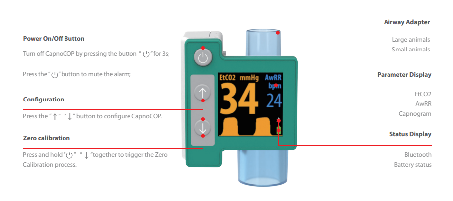 | Alarm | Kein Adapter, Adapter verstopft, keine Atmung erkannt, hohe AwRR, niedrige ETCO2, ETCO2 hoch, Temperatur außerhalb des Bereichs, Ende des Atmosphärendrucks Betriebsbereich, geringe Batterie |