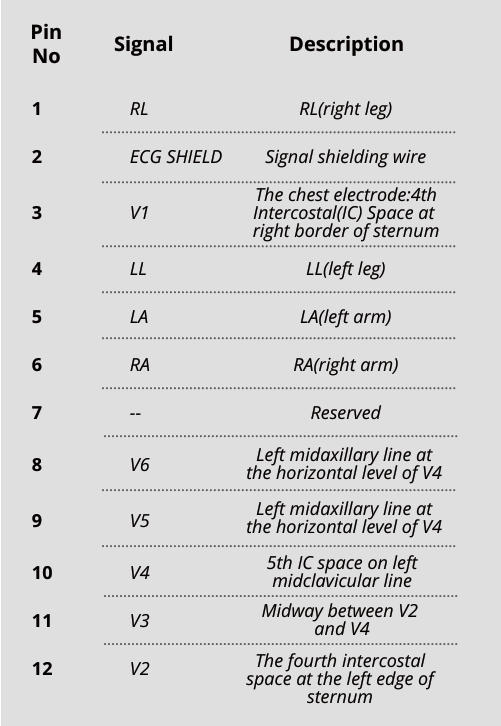 12-Ableitungs-EKG-Ableitungs-Eingangsschnittstelle J4/J10 ist Wie folgt definiert, der Steckdosenstiftabstand ist 2,54 mm: