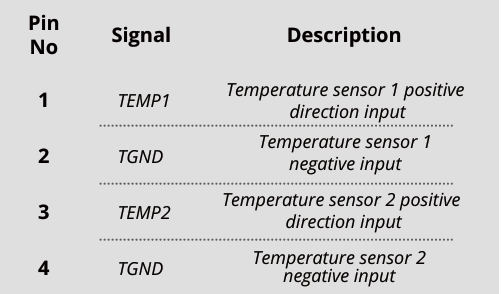 La interfaz de sonda de temperatura J3 se define como Como sigue, con un espaciado de 2,54 mm entre los receptáculos: